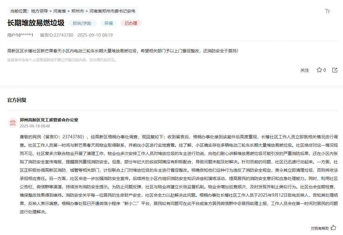 倾听群众呼声,破解民生难题。接到留言后,郑州高新区长椿社区工作人员第一时间前往小区实地查看。经了解,小区确实存在多辆电动三轮车长期大量堆放易燃垃圾的情况。据悉,社区和物业曾多次开展清理工作,并对车主进行劝说,同时在小区内张贴消防安全宣传海报,但由于部分老年人没有积极配合,导致问题未能及时解决。